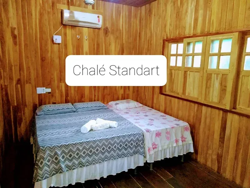 Chalé de madeira, estilo rústico, todo forrado com banheiro, em alvenaria, privativo, chuveiro elétrico, cama de casal, cama de solteiro, TV, frigobar, ar condicionado.
